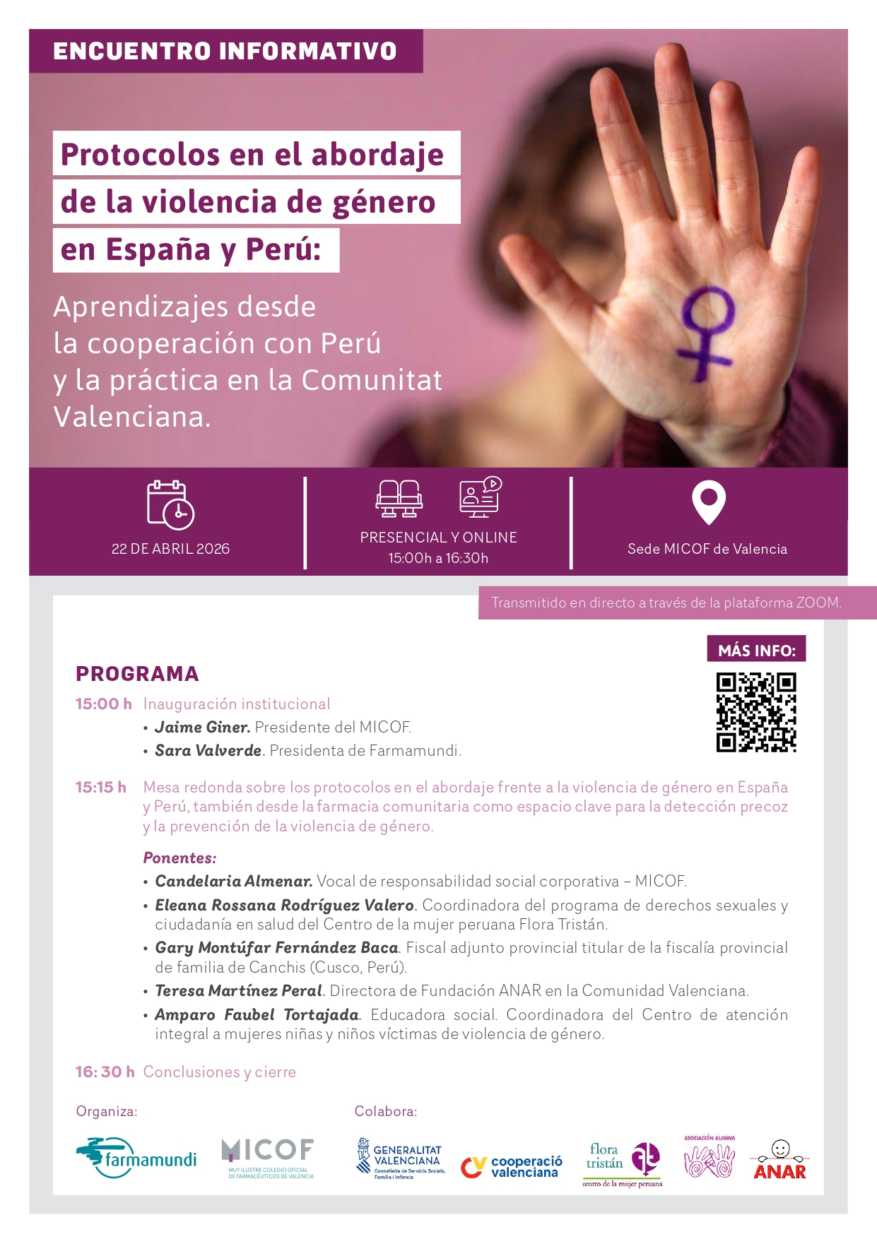 Organizamos un encuentro informativo este 22 de abril junto al Colegio Oficial de Farmacéuticos de Valencia (MICOF) que reunirá a profesionales de España y Perú —de entidades como Flora Tristán, Fundación ANAR o Asociación Alanna— para compartir experiencias, protocolos y buenas prácticas en la prevención y abordaje de la violencia de género, con especial atención al papel de la farmacia comunitaria.