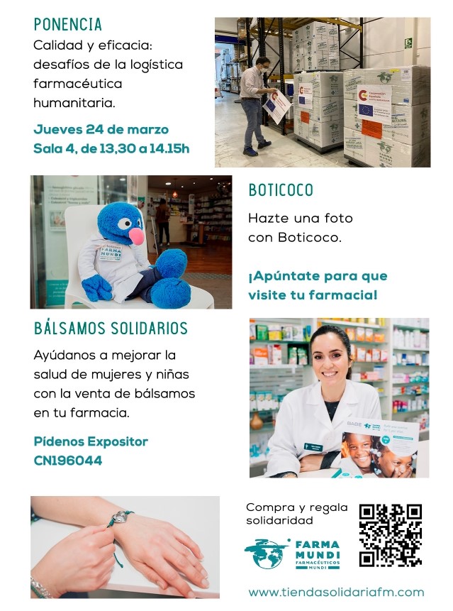 Además de participar desde el Stand 3F51 (Pabellón nº3), gracias al respaldo del COF de Madrid, Farmamundi, la primera ONG farmacéutica de España, estará presente con varias actividades más como una charla “Calidad y eficacia: desafíos de la  la logística farmacéutica humanitaria”,  que tendrá lugar el  24 de marzo en la sala 4 – de 13:30 a 14:15 horas, la exposición de un poster científico, el regreso de nuestro querido Boticoco  y la exposición divulgativa ´Vacunando’ que estará ubicada al lado de la zona de pósteres científicos.