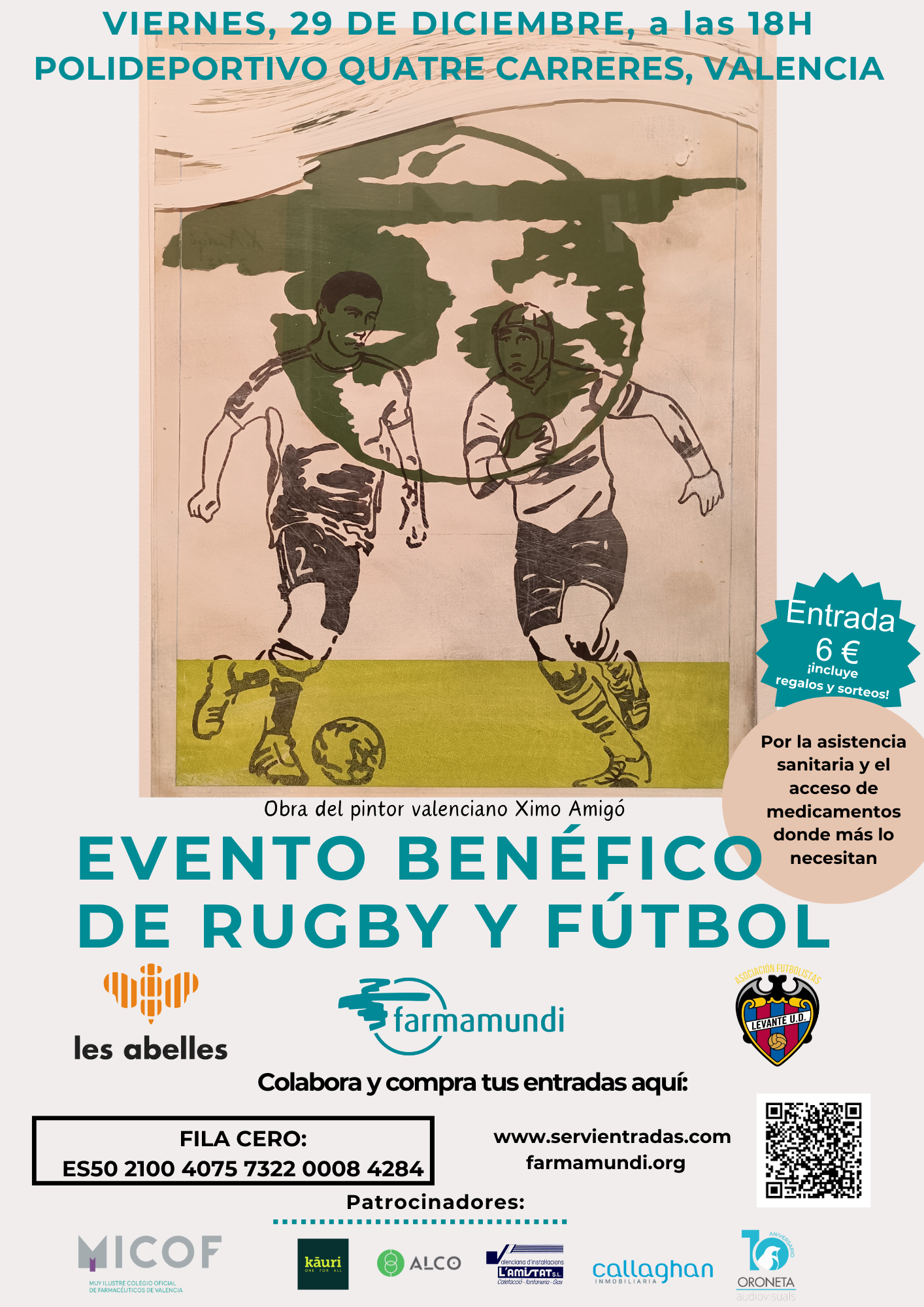 “Futbol y rugby unidos en un evento novedoso y solidario para mejorar la atención sanitaria de niños y niñas, a través de los proyectos que la ONG valenciana Farmamundi lleva a cabo en Latinoamérica y África. Será en el Polideportivo Quatre Carreres de Valencia a las 18 horas”, cuentan desde el Club les Abelles y la Asociación de veteranos del Levante UD.