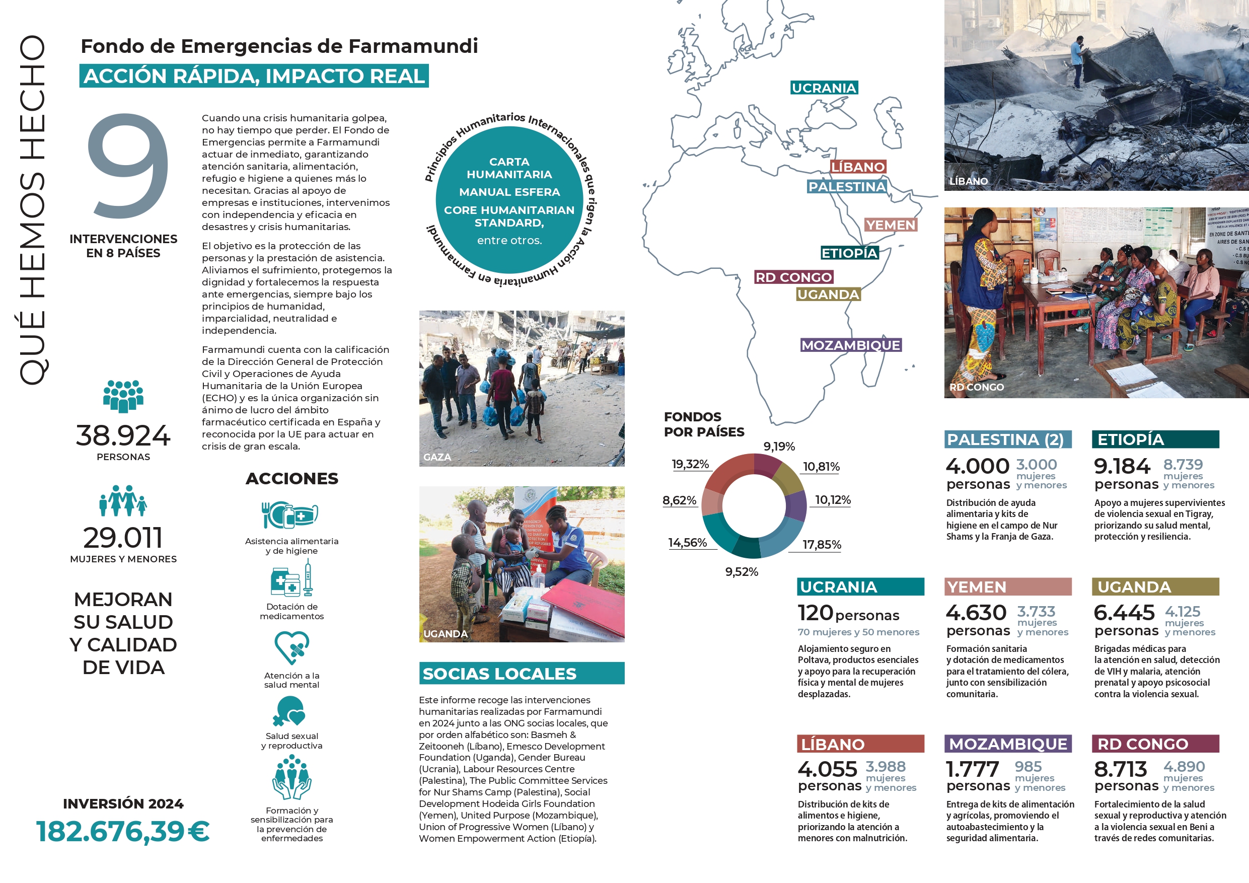 En Farmamundi hemos intensificado nuestra labor humanitaria en 2024 con nueve intervenciones en ocho países marcadas por conflictos armados, crisis crónicas y emergencias sanitarias. A través de nuestro Fondo de Emergencias, hemos brindado apoyo vital a 38.924 personas, de las cuales 29.011 son mujeres y menores, en países como Palestina, Ucrania, Yemen, Etiopía, Líbano, Uganda, Mozambique y la República Democrática del Congo (RDC). Ayuda alimentaria, asistencia sanitaria, dotación de medicamentos, atención a la salud sexual y reproductiva, prevención de la violencia sexual, formación y atención a la salud mental resumen las acciones de este 2024.
