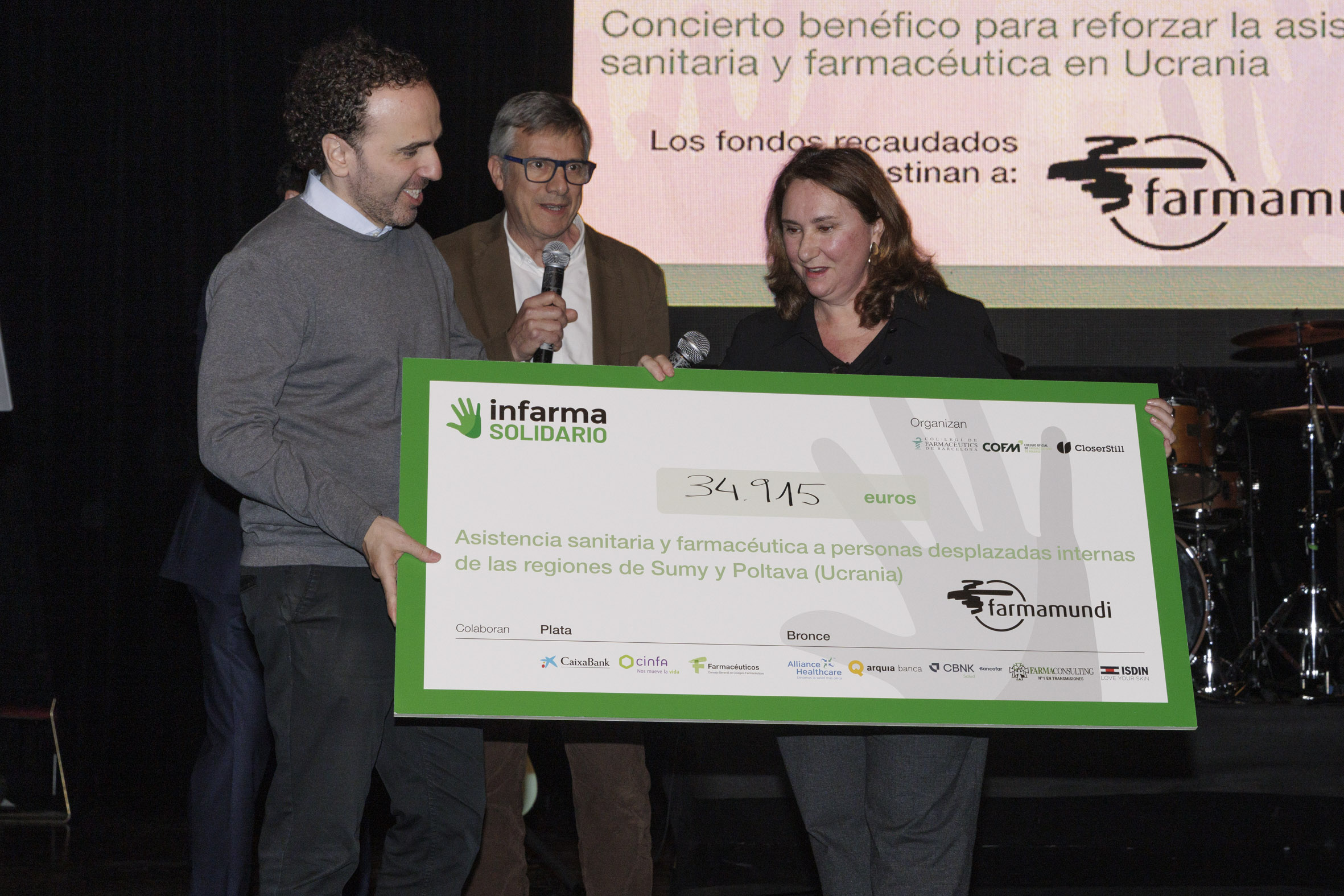 Valverde finalizó su intervención agradeciendo el apoyo a todas las compañeras y compañeros farmacéuticos asistentes al concierto y a las entidades patrocinadoras. “Gracias a Infarma Solidario, a los Colegios de Farmacéuticos de Barcelona, Madrid y Closer Still por hacer posible esta noche solidaria. También, gracias a nuestros patrocinadores: CaixaBanK, Cinfa, Consejo de Colegios Farmacéuticos, Alliance Healthcare, Arquia Bank, Banca para los colectivos esenciales (CBNK), Farmaconsulting e Isdin, por apostar por esta acción que impactará directamente en la población más vulnerable de Sumy y Poltava”, concluye la presidenta de Farmamundi.