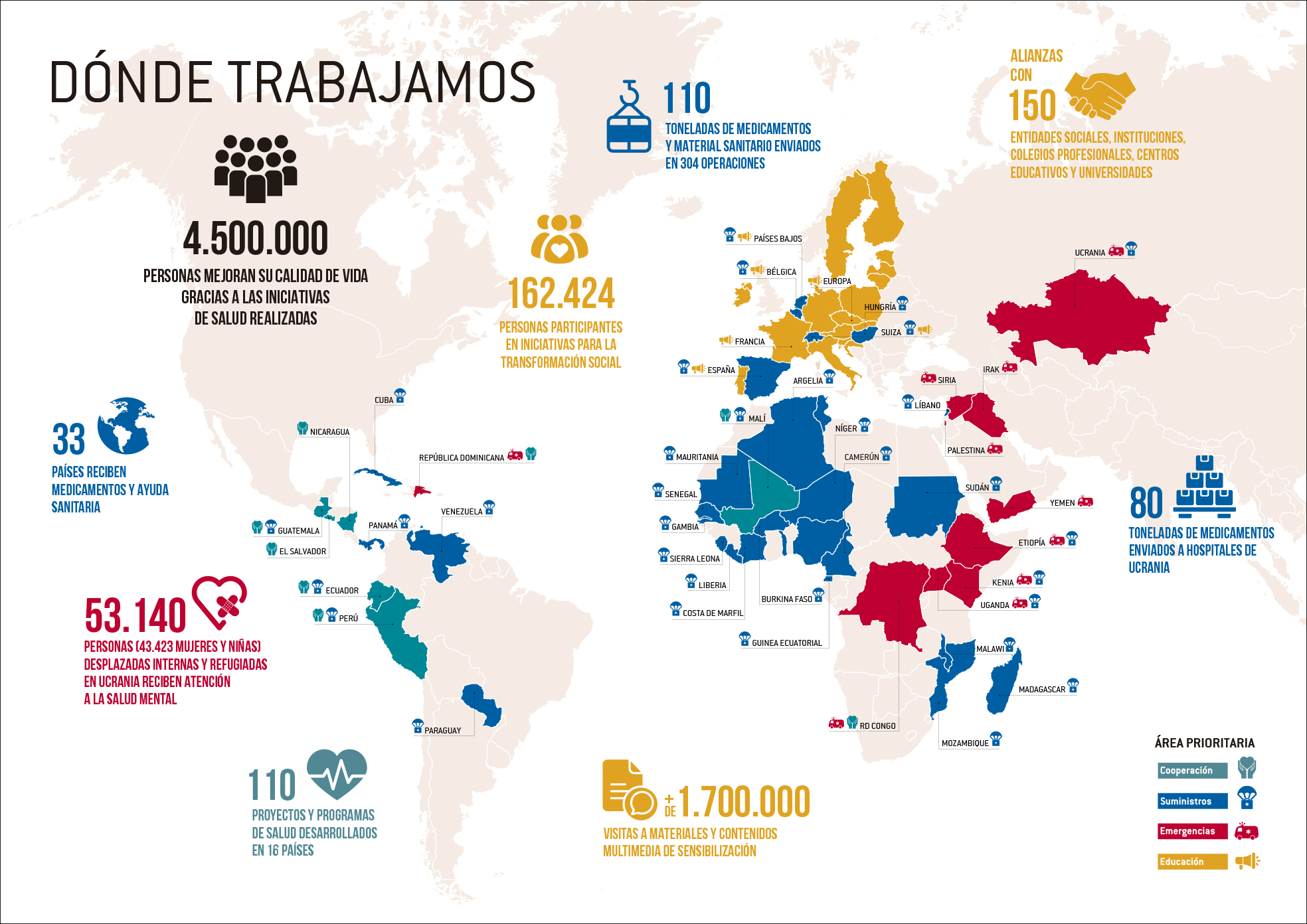 En el año que celebramos nuestro 30 aniversario, presentamos la memoria anual 2022, en la que hemos priorizado la acción humanitaria y de emergencia ocasionada por la guerra en Ucrania en medio de una gran inestabilidad mundial y donde destaca el suministro de 80 toneladas de medicamentos y material sanitario a los hospitales de Vinnitsya, Dnipro, Odesa y Leópolis. Además, hemos realizado 110 proyectos de salud integral en 16 países entre los que destacan Guatemala, El Salvador, Nicaragua, Perú, Etiopía, Uganda o Yemen, países estos últimos con sistemas sanitarios muy frágiles.
