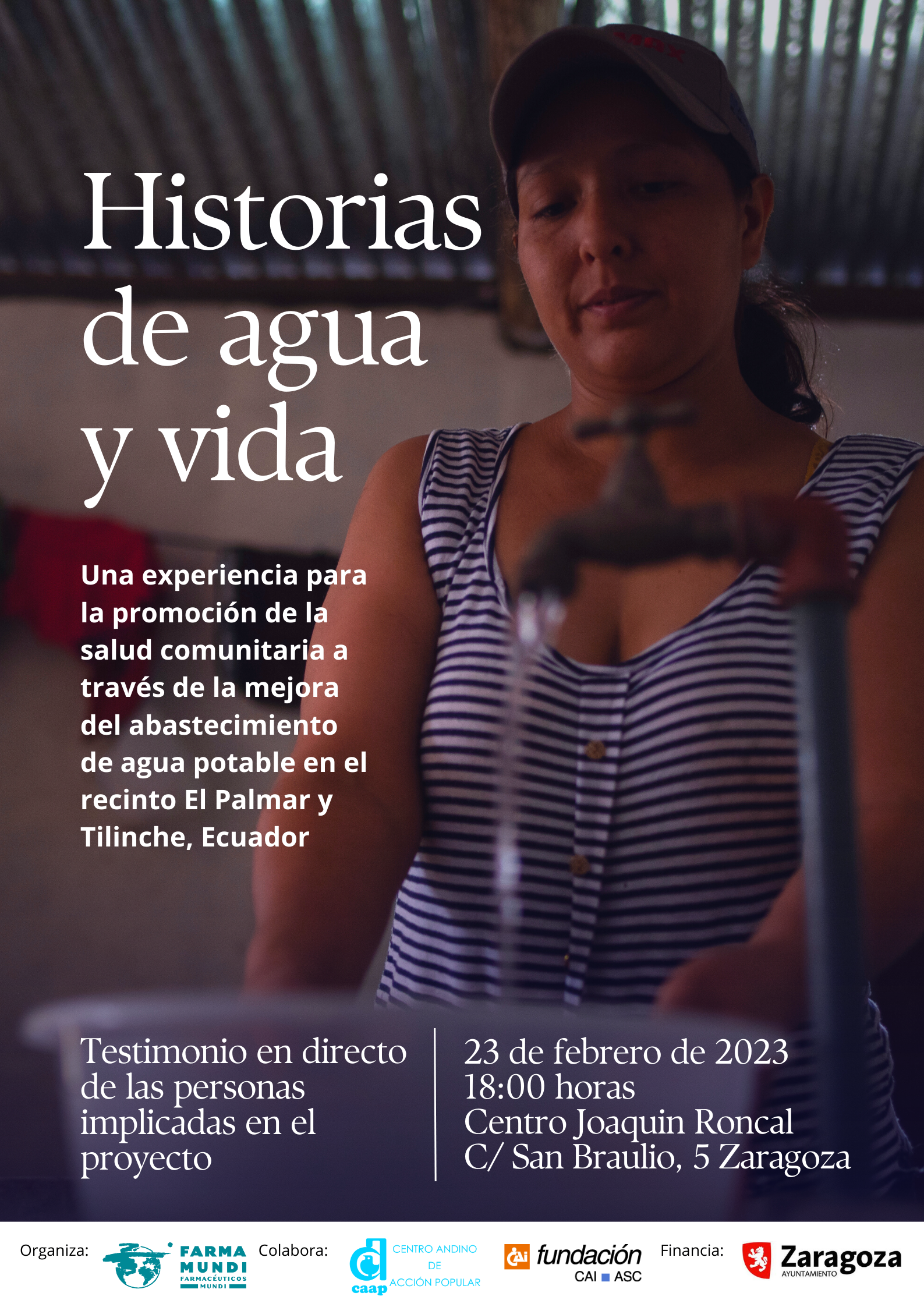 Desde Farmamundi os queremos invitar a la presentación del proyecto Historias de agua y vida. Una experiencia para la promoción de la salud comunitaria a través de la mejora del abastecimiento de agua potable en las comunidades del Palmar y Tilinche, Ecuador” impulsado por el Centro Andino de Acción Popular (CAAP) y Farmamundi, y financiado por el Ayuntamiento de Zaragoza. La presentación tendrá lugar el jueves 23 de febrero de 2023 a las 18:00 horas en el Centro Joaquín Roncal de la Fundación Caja Inmaculada en Zaragoza  (C/San Braulio 5-7).