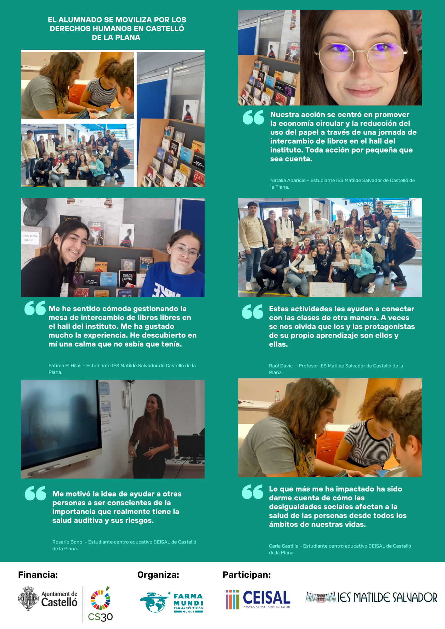 En el último año, más de 135 alumnas y alumnos del IES Matilde Salvador y del centro de estudios CEISAL han participado en este proyecto. En total han sido casi 500 personas, entre profesorado y alumnado, las que han participado en las actividades que se han venido realizado por el derecho a la salud en los centros educativos de Castelló de la Plana desde el 2020.